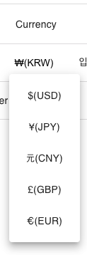 - Currency 드롭다운 UI 구현 및 Currency 변경 기능 구현,